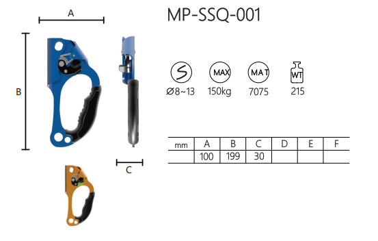 Der MP-SSQ-001 Climbing Ascender ist ein zuverlässiges Werkzeug für Kletteranwendungen. Es ist für die Arbeit mit Seilen mit einem Durchmesser von 8 –13 Millimetern ausgelegt. Es besteht aus der Aluminiumlegierung 7075 und bietet Haltbarkeit und Festigkeit. Der Ascender hat ein Gewicht von 215 Gramm und ist daher leicht zu tragen. Seine Abmessungen betragen 100 mm Länge (A), 199 mm Höhe (B) und 30 mm Breite (C) und sorgen für einen bequemen Griff und eine einfache Handhabung. Mit einer maximalen Tragfähigkeit von 150 Kilogramm sorgt es für Sicherheit beim Klettern. Der MP-SSQ-001 sorgt für eine effiziente Seilbewegung und sichere Klemmung und ist damit eine praktische Wahl für aufsteigende Seile.