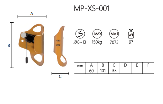 Der MP-XS-001 Chest Ascender ist ein hochfunktionales Werkzeug, das für Kletter- und Seilzugangsaufgaben entwickelt wurde. Es ist mit Seilen mit einem Durchmesser von 8 mm bis 13 mm kompatibel und bietet zuverlässige Leistung in anspruchsvollen Umgebungen. Der aus der robusten Aluminiumlegierung 7075 gefertigte Ascender ist mit einem Gewicht von nur 97 Gramm sowohl leicht als auch langlebig. Seine Abmessungen betragen 60 mm Länge (A), 101 mm Höhe (B) und 33 mm Breite (C), wodurch es kompakt und einfach zu handhaben ist.