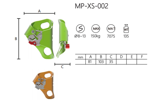 Der MP-XS-002-Aufsteiger aus Aluminiumlegierung ist ein zuverlässiges Werkzeug für Kletter- und Seilzugangsaufgaben. Es ist mit Seilen kompatibel, die einen Durchmesser zwischen 8 mm und 13 mm haben. Dieser aus der Aluminiumlegierung 7075 gefertigte Ascender vereint Festigkeit und Langlebigkeit in einem leichten Paket mit einem Gewicht von nur 135 Gramm. Seine Abmessungen (81 mm Länge, 103 mm Höhe und 35 mm Breite) sorgen für einen bequemen Griff und erleichtern die Handhabung während des Betriebs.