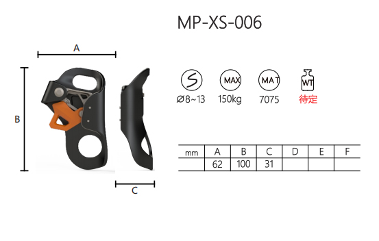 Der rechte Brustaufsteiger MP-XS-006 ist ein wichtiges Werkzeug für Kletter- und Seilzugangsarbeiten. Es ist für die Arbeit mit Seilen mit einem Durchmesser von 8 bis 13 Millimetern ausgelegt. Dieses Gerät besteht aus einer hochwertigen 7075-Aluminiumlegierung und ist robust und langlebig. Sein Gewicht muss noch bestimmt werden. Die Abmessungen betragen 62 mm Länge (A), 100 mm Höhe (B) und 31 mm Breite (C) und bieten einen bequemen Griff und eine einfache Bedienung.