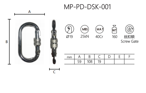 Der MP-PD-DSK-001 ist ein robuster Screw Gate-Karabiner aus legiertem 40Cr-Stahl mit einer Oberflächenbehandlungsqualität von 160. Es verfügt über einen MBS von 25 kN und einen Durchmesser von 19 mm und gewährleistet so zuverlässige Festigkeit und Sicherheit unter anspruchsvollen Bedingungen.