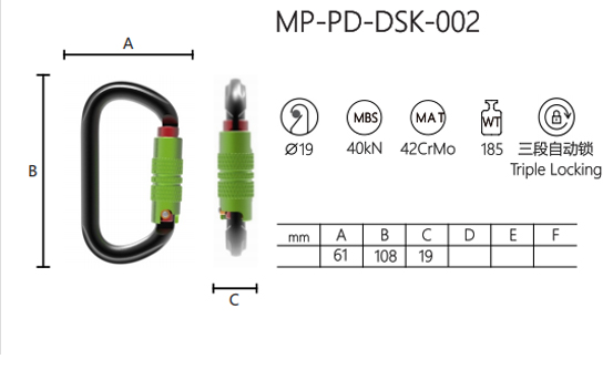 Der MP-PD-DSK-002 ist ein robuster Triple-Locking-Karabiner aus legiertem 42CrMo-Stahl mit einer Oberflächenbehandlungsqualität von 185. Es verfügt über einen MBS von 40 kN und einen Durchmesser von 19 mm und gewährleistet so zuverlässige Festigkeit und Sicherheit unter anspruchsvollen Bedingungen.