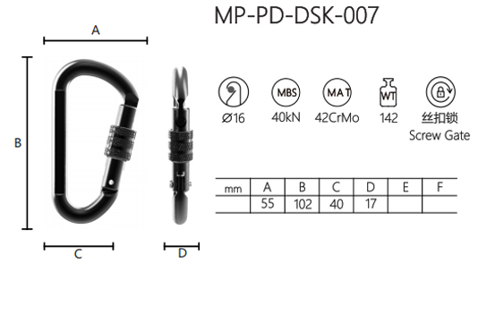 Der MP-PD-DSK-007 ist ein Aluminium-Schraubentorkarabiner aus legiertem 42CrMo-Stahl mit einer Oberflächenbehandlungsqualität von 142. Es verfügt über einen MBS von 40 kN und einen Durchmesser von 16 mm und gewährleistet so zuverlässige Festigkeit und Sicherheit unter anspruchsvollen Bedingungen.
