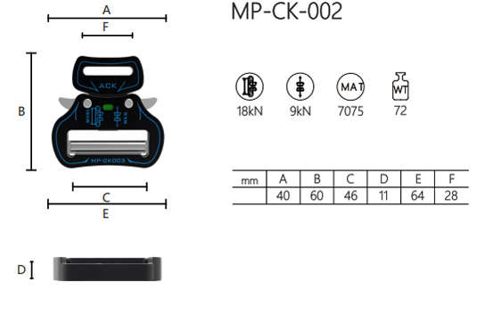 Diese hochfeste Schnellverschlussschnalle, MP - CK - 002, besteht aus der Aluminiumlegierung 7075, einem Material, das für sein hervorragendes Festigkeits-Gewichts-Verhältnis und seine Korrosionsbeständigkeit bekannt ist. Die Schnalle hat die Abmessungen A 40 mm, B 60 mm, C 46 mm, D 11 mm, E 64 mm und F 28 mm. Es kann Lasten von 18 kN und 9 kN tragen und gewährleistet so eine zuverlässige Leistung in verschiedenen Anwendungen. Die WT72-Kennzeichnung lässt darauf schließen, dass es einem bestimmten Gewicht standhält. Mit seinem schlanken Design und der robusten Struktur ermöglicht es eine schnelle und einfache Verbindung und Freigabe. Es eignet sich für Outdoor-Ausrüstung, Taschen usw. und bietet eine sichere und bequeme Befestigungslösung.