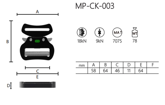 Diese hochfeste Schnellverschlussschnalle, MP - CK - 003, besteht aus der Aluminiumlegierung 7075, einem Material, das für sein hervorragendes Festigkeits-Gewichts-Verhältnis und seine Korrosionsbeständigkeit bekannt ist. Die Schnalle hat die Abmessungen A 58 mm, B 64 mm, C 46 mm, D 11 mm, E 64 mm und F 6 mm. Es kann Lasten von 18 kN und 9 kN tragen und gewährleistet so eine zuverlässige Leistung in verschiedenen Anwendungen. Die WT78-Kennzeichnung lässt darauf schließen, dass es einem bestimmten Gewicht standhält. Mit seinem schlanken Design und der robusten Struktur ermöglicht es eine schnelle und einfache Verbindung und Freigabe. Es eignet sich für Outdoor-Ausrüstung, Taschen usw. und bietet eine sichere und bequeme Befestigungslösung.