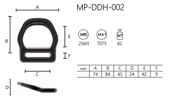 Der D-förmige Ring MP-DDH-002 ist ein robuster Verbinder aus einer Aluminiumlegierung 7075 mit einer Oberflächenbehandlungsqualität von 62. Es verfügt über einen MBS von 25 kN und gewährleistet so zuverlässige Festigkeit und Sicherheit unter anspruchsvollen Bedingungen.