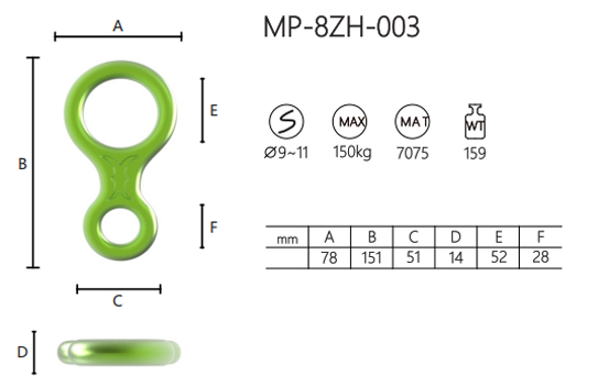 Der MP - 8ZH - 003 Figure - 8 Descender ist ein zuverlässiges Werkzeug zum Klettern und Abseilen. Es besteht aus einer langlebigen Aluminiumlegierung 7075 und hat eine maximale Tragfähigkeit von 150 kg. Es funktioniert gut mit Seilen mit einem Durchmesser von 9 – 11 mm. Mit einem Gewicht von nur 159 g und kompakten Abmessungen (A:78 mm, B:151 mm, C:51 mm, D:14 mm, E:52 mm, F:28 mm) ist es leicht zu tragen. Das glatte und ergonomische Design sorgt für eine komfortable Handhabung und eine hervorragende Seilkontrolle bei Abfahrten.