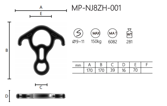 Der MP-NJ8ZH-001 Figure 8 Descender ist ein hochwertiges Gerät für den Abstieg aus der Luft. Es besteht aus einer Aluminiumlegierung 6082 und hat eine maximale Tragfähigkeit von 150 kg. Es funktioniert gut mit Seilen mit einem Durchmesser von 9 – 11 mm. Mit einem Gewicht von 281 g und den Abmessungen A:170 mm, B:170 mm, C:39 mm, D:16 mm, E:70 mm und F: nicht angegeben ist es robust und zuverlässig. Sein Doppellochdesign ermöglicht einen reibungslosen Seildurchgang und eine einfache Kontrolle beim Abstieg. Das ergonomische Design sorgt für eine komfortable Handhabung. Es ist einfach zu bedienen und für verschiedene Luftarbeiten und Rettungseinsätze geeignet. Seine kompakte Größe macht es bequem für Lagerung und Transport.