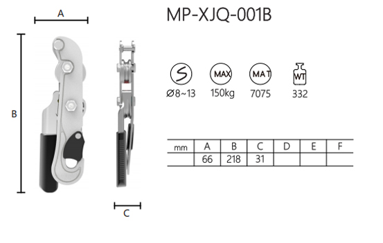 Der industrielle Seilgreifer MP-XJQ-001B ist aus der Aluminiumlegierung 7075 gefertigt und gewährleistet Haltbarkeit und Festigkeit. Es kann eine maximale Belastung von 150 kg bewältigen und ist mit Seilen mit einem Durchmesser von 8~13 mm kompatibel. Die Abmessungen sind A66 mm, B218 mm und C31 mm, mit einem Gewicht von 332 g. Sein kompaktes und tragbares Design erleichtert das Tragen. Der Seilgreifer bietet einen zuverlässigen Halt und eine stabile Kontrolle beim Klettern oder Absteigen. Es bietet hervorragende Handhabung und Sicherheit und ist somit ein praktisches Werkzeug für industrielle Anwendungen.