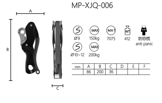 Der Anti-Panik-Senker MP-XJQ-006 besteht aus einer Aluminiumlegierung 7075. Es hat eine maximale Belastung von 150 kg für 9 mm Seil und 200 kg für 10~12 mm Seil. Das Gerät misst 86 mm in A, 200 mm in B und 36 mm in C und wiegt 412 g. Sein Anti-Panik-Design sorgt für eine stabile und zuverlässige Leistung. Der Absenker sorgt für einen sanften und kontrollierbaren Abstieg mit einstellbaren Mechanismen für unterschiedliche Seildurchmesser. Seine kompakte Größe und sein geringes Gewicht machen es einfach zu tragen und zu verwenden. Das Gerät bietet eine effektive Steuerung bei Abstiegsvorgängen und ist damit ein praktisches Werkzeug für verschiedene Szenarien.