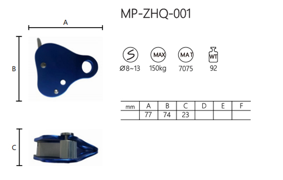 Der MP-ZHQ-001 ist ein robustes mechanisches Gerät zum sicheren Greifen von Seilen mit Durchmessern von 8 - 13 mm. Es besteht aus der Aluminiumlegierung 7075 und hat eine maximale Tragfähigkeit von 150 kg, wodurch es für anspruchsvolle Anwendungen geeignet ist.