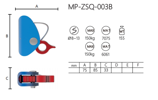 Der MP-ZSQ-003B ist ein Seilgreifer aus Aluminiumlegierungen der Typen 7075 und 6061, der zum Greifen von Seilen mit Durchmessern von 8 bis 13 mm entwickelt wurde. Es verfügt über eine maximale Tragfähigkeit von 150 kg und gewährleistet so eine zuverlässige Leistung in verschiedenen Umgebungen.