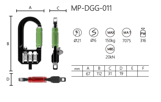 Der MP-DGG-011 ist ein robuster Klettersicherheits-Autoverriegeler. Es hat eine Länge (A) von 67 mm, eine Gesamthöhe (B) von 112 mm und eine Breite (C) von 31 mm. Das Schließfach verfügt über eine Hakenöffnung (D) von 19 mm. Es besteht aus den Materialien 7075 und 316 und vereint Festigkeit mit Haltbarkeit. Das Gerät verfügt über eine MBS von 20 kN und eine maximale Tragfähigkeit von 150 kg. Es ist so konzipiert, dass es effizient mit Seilen mit einem Durchmesser von 6 mm und 21 mm arbeitet und so einen reibungslosen Betrieb und eine zuverlässige Leistung gewährleistet. Darüber hinaus verfügt es über einen Haken mit Abmessungen von 33 mm Durchmesser und 25 mm Breite.