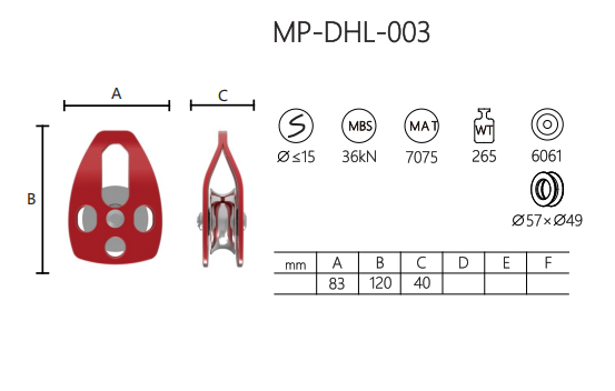 Die MP-DHL-003 ist eine leichte Riemenscheibe, die für eine effiziente Lasthandhabung konzipiert ist. Es besteht aus einer langlebigen Aluminiumlegierung 6061 und bietet Zuverlässigkeit mit einer maximalen Bruchfestigkeit (MBS) von 36 kN. Es bietet Platz für Seile mit einem Durchmesser von bis zu 15 mm und wiegt 265 Gramm. Die Riemenscheibe weist eine Breite von 83 mm (A), eine Gesamthöhe von 120 mm (B) und einen Abstand von 40 mm (C) auf. Die Mittelachse misst Ø57ר49 mm. Die Aluminiumscheibe 7075 sorgt für einen reibungslosen Betrieb und eine lange Lebensdauer. Der MP-DHL-003 ist ideal für Anwendungen, die zuverlässige Rigging-Lösungen erfordern, beispielsweise in industriellen Umgebungen oder bei Outdoor-Aktivitäten. Seine kompakte Größe und langlebige Konstruktion machen es praktisch für Aufgaben, bei denen Platz und Gewicht eine Rolle spielen.