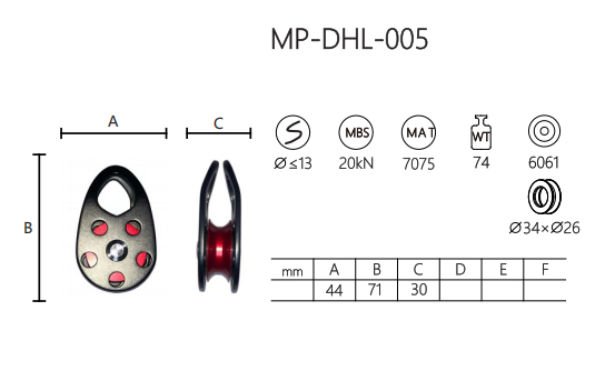 Der MP-DHL-005 ist eine kompakte Riemenscheibe, die für Kletteranwendungen entwickelt wurde. Es besteht aus der Aluminiumlegierung 6061 und kombiniert Haltbarkeit mit einer Leichtbauweise von 74 Gramm. Mit einer maximalen Bruchfestigkeit (MBS) von 20 kN trägt es Seile mit einem Durchmesser von bis zu 13 mm.