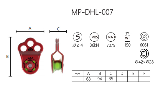 Der MP-DHL-007 ist eine robuste Einzelriemenscheibe, die für vielseitige Anwendungen entwickelt wurde. Es besteht aus einer langlebigen 6061-Aluminiumlegierung und verfügt über eine kompakte und dennoch robuste Konstruktion. Mit einer maximalen Bruchfestigkeit (MBS) von 36 kN kann es Seile mit einem Durchmesser von bis zu 14 mm verarbeiten.