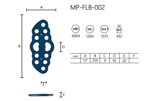 Der MP-FLB-002 ist eine blaue Schleuderplatte mit mehreren Löchern. Es hat eine Länge (A) von 117 mm und eine Breite (B) von 250 mm. Die Dicke (C) der Platte beträgt 9 mm, mit einem Lochdurchmesser (D) von 42 mm und einem Lochabstand (E) von 20 mm. Mit einem Gewicht von 432 g besteht es aus einer Aluminiumlegierung 7075. Der MP-FLB-002 verfügt über MBS 60 kN und WLL 12 kN, was auf seine Tragfähigkeit hinweist. Sein Mehrlochdesign ermöglicht flexible Verbindungen und eignet sich daher für Takelage- und Hebeanwendungen. Die Platte verteilt die Kräfte gleichmäßig auf mehrere Punkte und erhöht so die Sicherheit und Stabilität bei Hebevorgängen.
