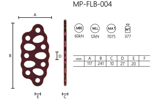Die MP-FLB-004 ist eine Kraftverteilungsplatte aus rotem Metall mit mehreren Löchern. Es hat eine Länge (A) von 117 mm, eine Breite (B) von 241 mm, eine Dicke (C) von 10 mm, einen Lochdurchmesser (D) von 27 mm, einen Lochabstand (E) von 20 mm und ein Gewicht von 377 g. Die Platte weist MBS 60 kN und WLL 12 kN auf, was auf ihre Tragfähigkeit hinweist. Es besteht aus der Aluminiumlegierung 7075 und bietet Festigkeit und Haltbarkeit.