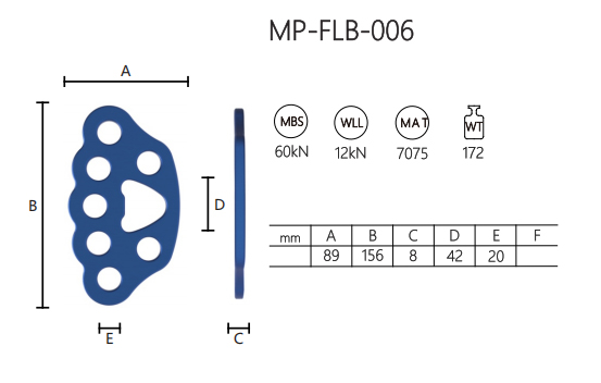 Die MP-FLB-006 ist eine blaue Kraftverteilungsplatte mit mehreren Löchern. Es hat eine Länge (A) von 89 mm, eine Breite (B) von 156 mm, eine Dicke (C) von 8 mm, einen Lochdurchmesser (D) von 42 mm, einen Lochabstand (E) von 20 mm und ein Gesamtgewicht von 172 mm. Die Platte weist Markierungen auf, die MBS 60 kN, WLL 12 kN und MAT 7075 anzeigen. Es besteht aus einer Aluminiumlegierung und bietet Festigkeit und leichte Eigenschaften.