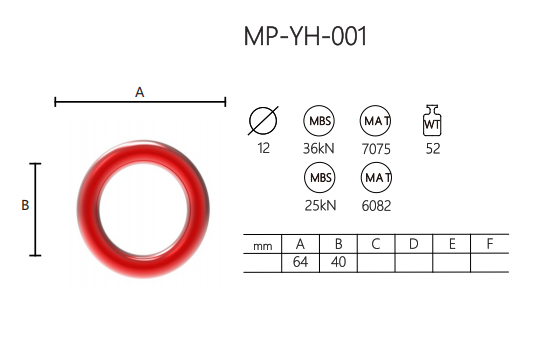 Der MP-YH-001 ist ein roter kreisförmiger Ring mit bestimmten Abmessungen und Markierungen. Sein Außendurchmesser (A) beträgt 64 mm und der Innendurchmesser (B) 40 mm. Der Ring weist mehrere Aufschriften auf: MP-YH-001 oben sowie Symbole und Werte, die MBS-Werte von 36 kN und 25 kN, MAT-Werte von 7075 und 6082 und einen WT-Wert von 52 anzeigen. Diese Markierungen bezeichnen wahrscheinlich Materialspezifikationen, Festigkeitsbewertungen und andere technische Details, die für ihre Anwendung relevant sind.